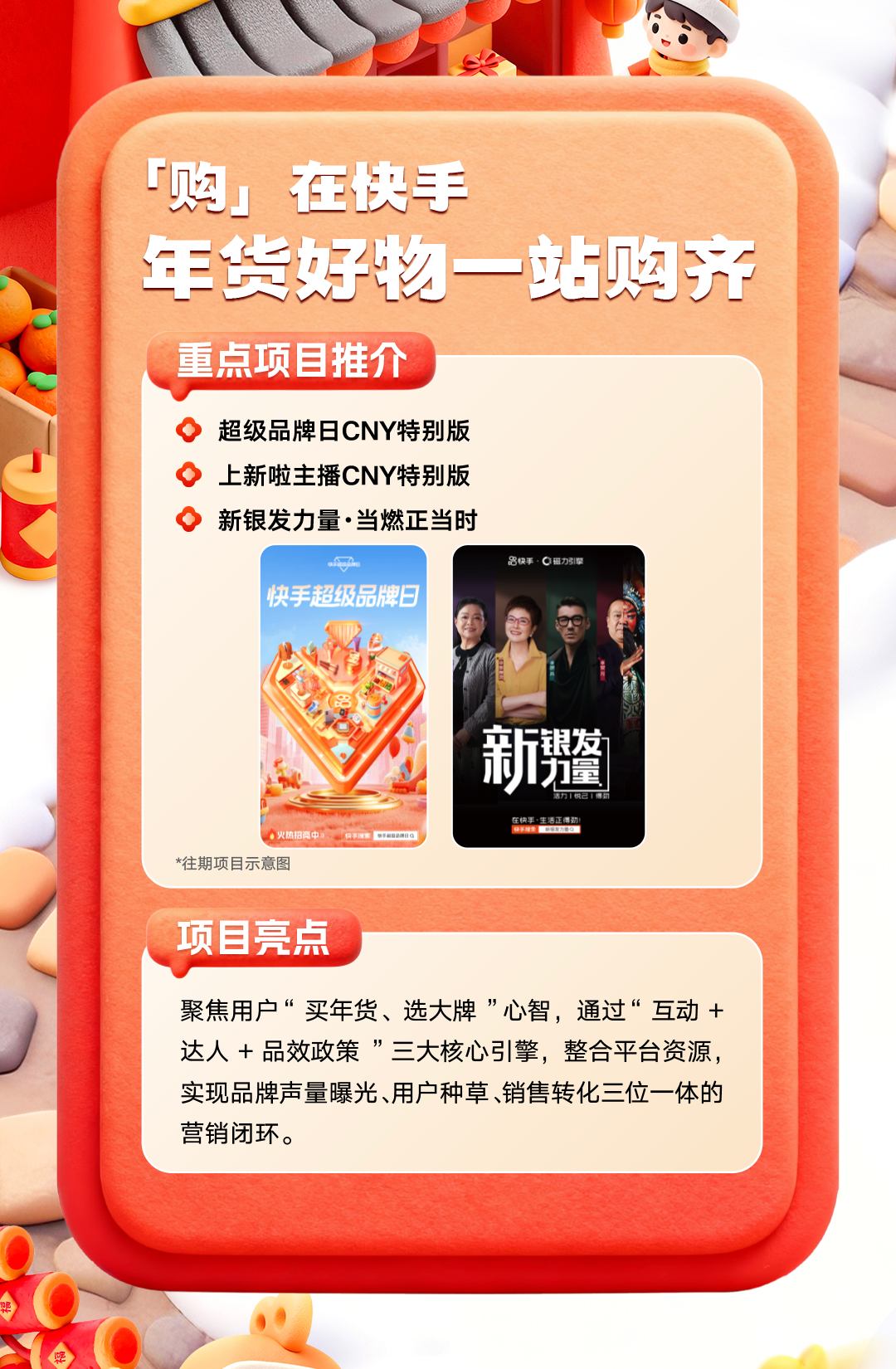 马年春节,快手围绕“玩逛看聚购”,为品牌提供了丰富的营销场景与合作资源,帮助品牌在新年味中实现更温暖的新春破圈营销、更紧密的用户情感连接。