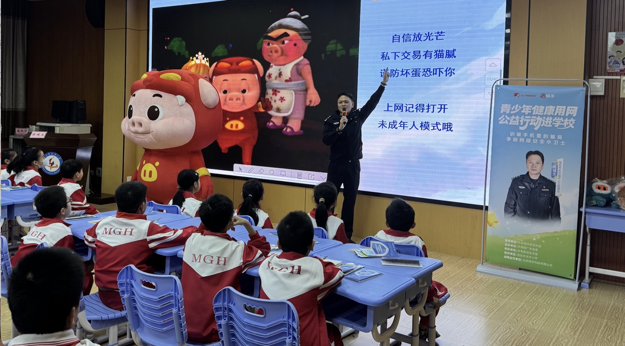 由快手联合平台创作者“猪猪侠”创作的短片也走进课堂,用小朋友喜爱的动画角色生动演绎游戏皮肤私下交易的骗局。当猪猪侠人偶走进礼堂一刹那,学生们一片欢呼。