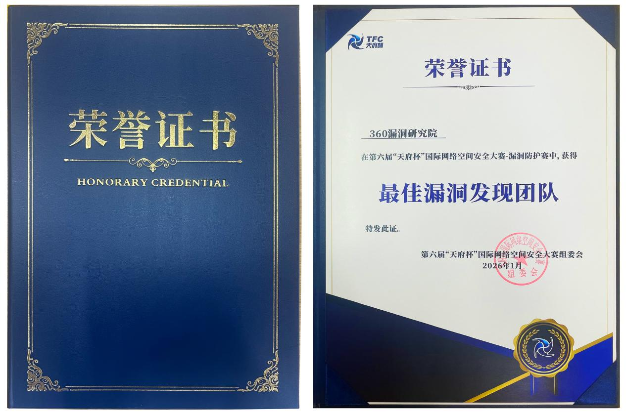 其中,360数字安全集团旗下漏洞研究院以单一独立战队身份参赛,凭借扎实的漏洞挖掘技术、前沿的AI赋能能力与丰富的实战攻防经验,在激烈比拼中一举夺魁,荣获独立战队积分榜第一名,并凭借其漏洞发现的高质量与高价值,获评“最佳漏洞发现团队”。此次加冕,是360在创下首届至第三届“天府杯”三连冠历史纪录后,于顶级赛场上的实力回归。