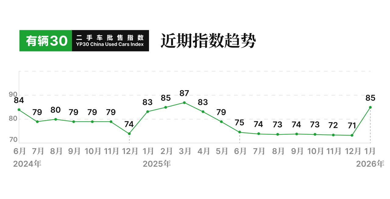 有辆科技推出的行业权威指标——“有辆30二手车批售指数”正式发布2026年1月最新数据,录得指数为85点。受春节前汽车消费市场强劲需求驱动,该指数环比大幅上涨19.7%,创下自发布以来单月最大的涨幅纪录。与此同时,本次“有辆30指数”首次完整公开了构成该指数的全部30款基准车型清单,这不仅标志着指数的透明度与市场参考价值迈上新台阶,也为观察中国二手车市场的真实动态提供了更为清晰、可信的量化框架。