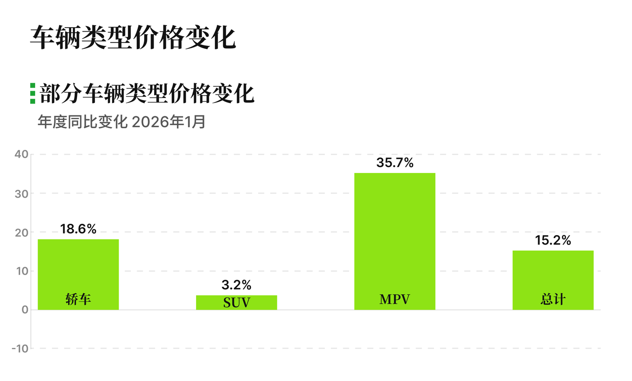 需求偏好转移,MPV成新焦点:从车辆类型看,市场热点发生明显切换。MPV车型价格同比暴涨35.7%,成为增长最快的品类,反映了家庭出行与休闲场景需求的爆发。传统热门品类SUV同比微增3.2%,轿车增长18.6%。