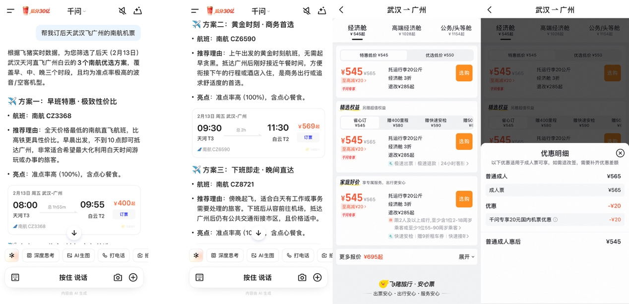 例如,当用户对千问APP说“帮我订后天武汉飞广州的南航机票”,千问即刻提供符合用户要求的CZ3368、CZ6590、CZ8721三个航班,点击对应商品卡片,三张机票均显示“千问专享”优惠,点击预订都可享受立减。