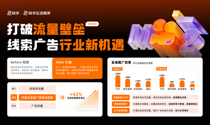 2026年3月,快手生活服务将推出「全域流量」模式,为助力商家高效获客,创新性地引入生活服务流量,打破自然流量与商业流量的边界,以商家在快手全站流量中的线索价值最大化为目标,帮助商家获取额外曝光、优化流量结构,从而提升线索转化效率与整体ROI,更好地满足商家经营需求。