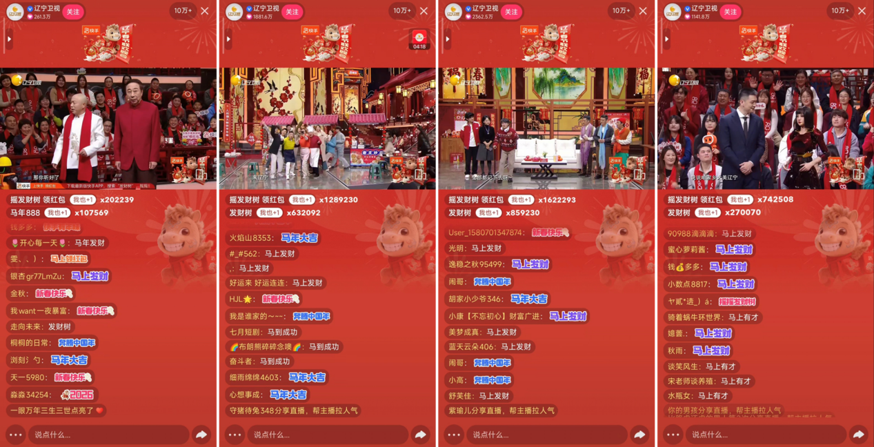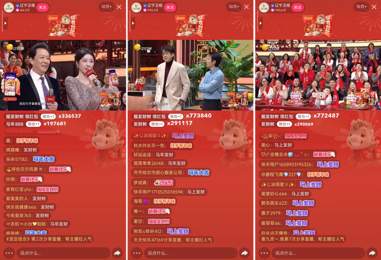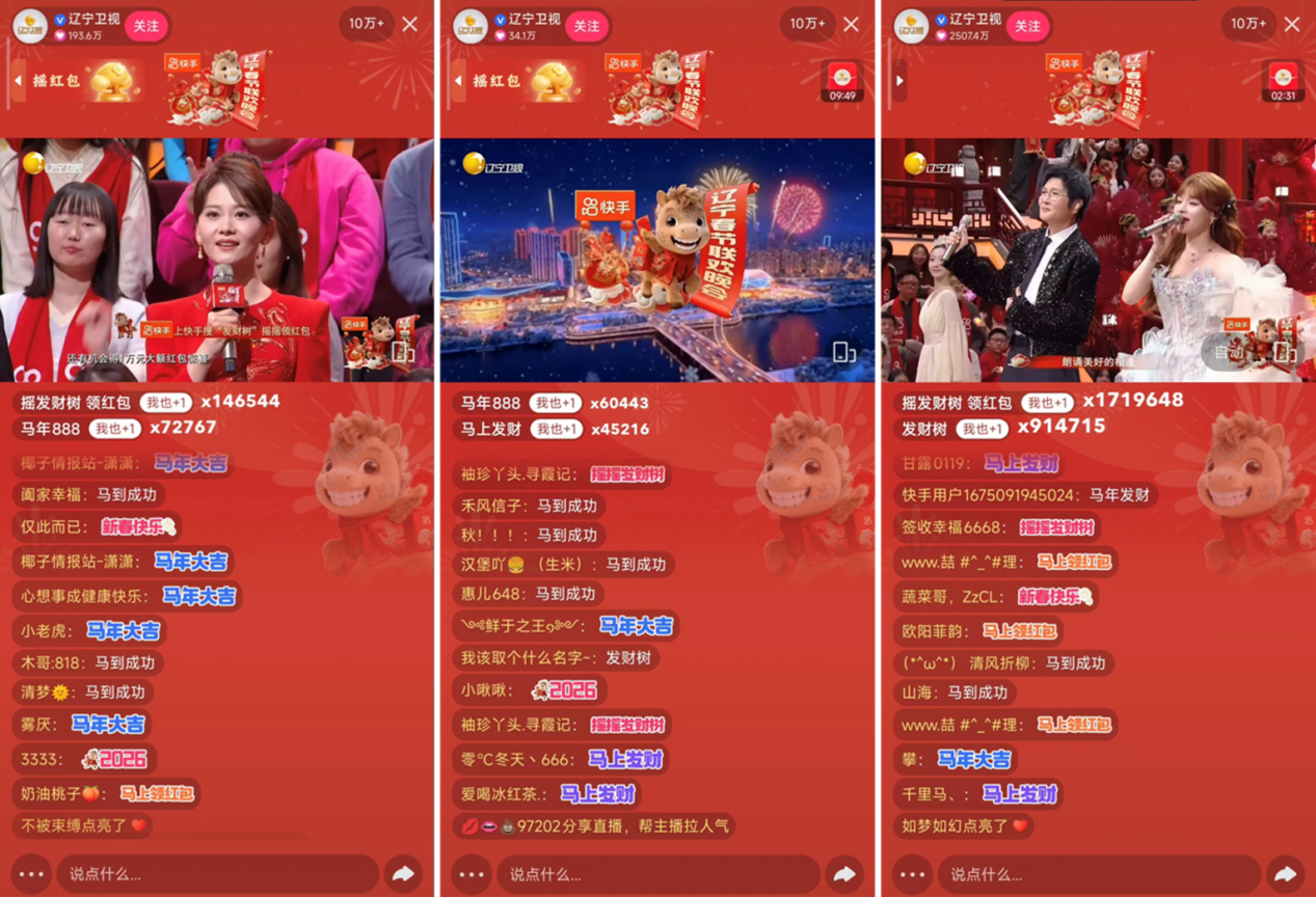 快手有年味,奔腾中国年。作为《2026辽宁春晚》冠名方,快手不仅为晚会营造围炉夜话般的亲切感,助力辽韵风华走向全国观众的心灵深处;还通过“专属红包雨”等大小屏互动玩法,把热闹欢腾从声光电舞台延伸到了天南海北。当天,@辽宁卫视 快手直播间观看人次达2.55亿,收获全网热搜817个,成为除夕前夜的人气聚集地。
