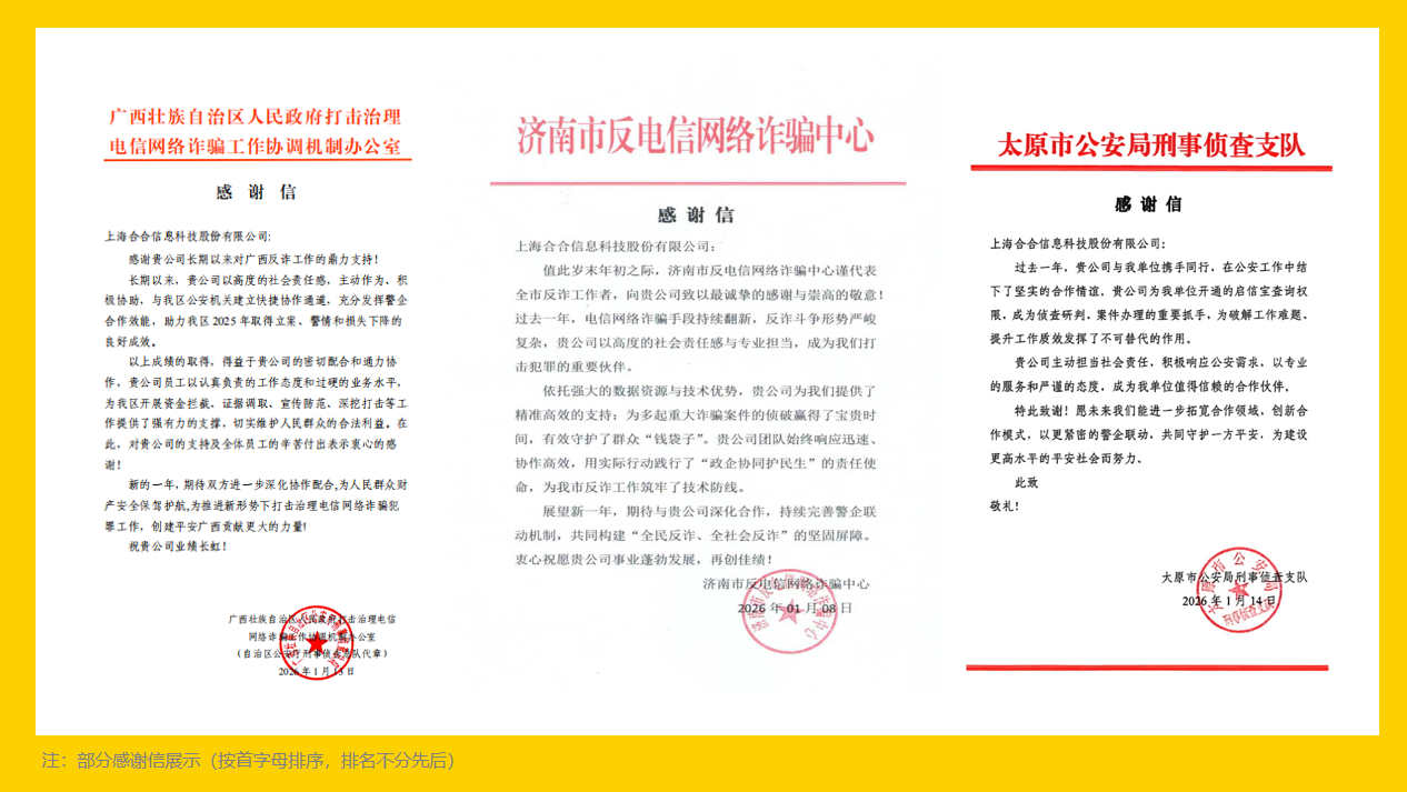 近期,合合信息旗下启信宝陆续收到来自南京、济南、太原、广西壮族自治区等省市反诈相关部门的感谢信。致谢单位涵盖省级打击治理电信网络诈骗协调机构、市县级刑侦支队与新型犯罪研究作战中心等,体现出“科技反诈”工作在全国范围内广泛落地,警企双方共同守护人民群众的财产安全。