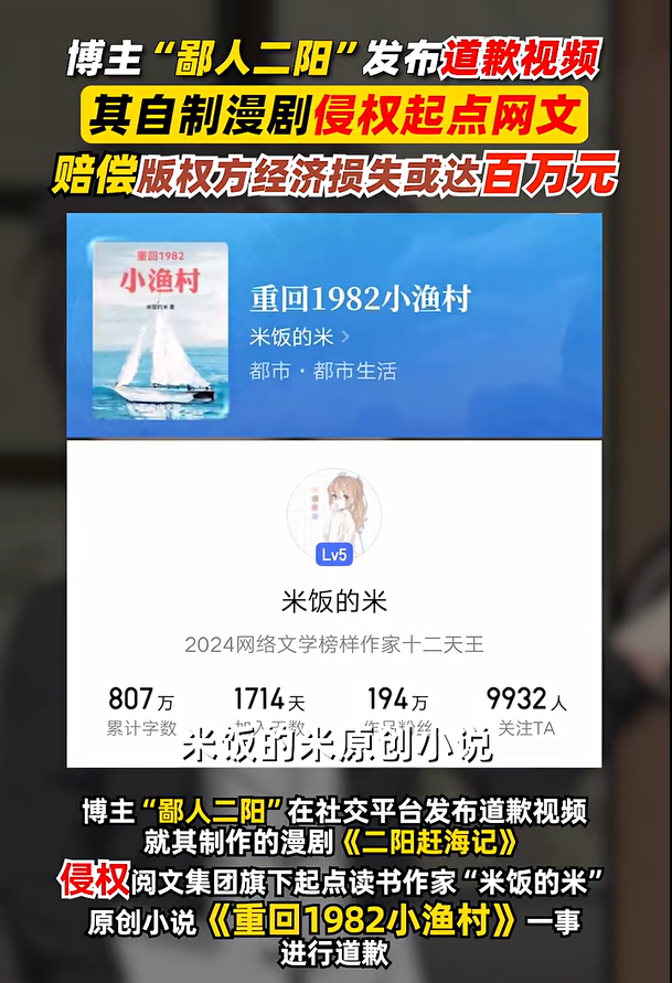 近日,自媒体博主“鄙人二阳”通过抖音等平台发布道歉视频,就其制作的漫剧《二阳赶海记》侵权阅文集团旗下起点读书作家“米饭的米”原创小说《重回1982小渔村》一事进行道歉。资料显示,《重回1982小渔村》是一部重生年代题材的精品网文作品,作家“米饭的米”曾凭借该作品入选网络文学榜样作家十二天王。