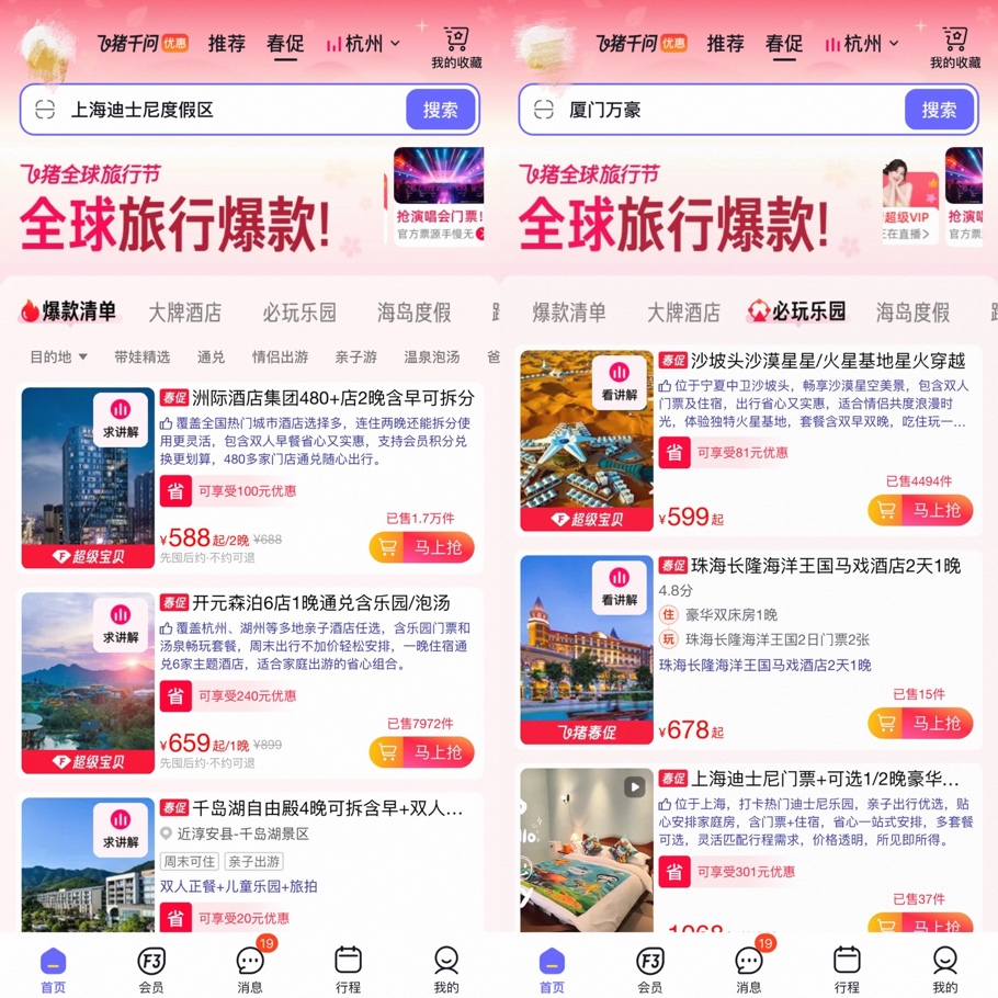 经验丰富的常旅客格外看中品牌会员权益的含金量。今年春促,飞猪“双11”爆款强势回归,会员在飞猪“万豪国际集团旗舰店”预订春促套餐,均可累计房晚和积分及会员权益;洲际酒店集团旗舰店推出的全国多品牌480店通兑套餐,除了价格更具性价比,还包含了房晚和积分,累计销量已破万件。在“硬核”权益的加持下,这些酒店集团的销量远超去年同期。希尔顿、凯悦、万达酒店及度假村、美高梅等为88VIP提供专属折扣的大牌酒店同样火爆。