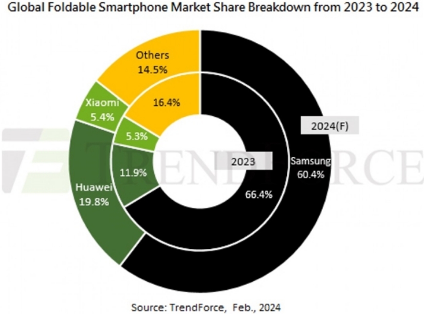 华为以11.9%的市场份额位居第二,这要归功于中国市场对其折叠屏手机的强劲需求。TrendForce集邦咨询预测,华为可能在2024年占据折叠屏手机市场接近20%的份额。小米折叠屏手机出货量位居全球第三,市场份额为5.4%。