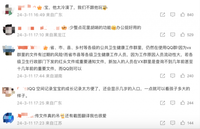 不少网友在腾讯QQ官微下留言评论,“QQ 空间记录宝宝的成长记录太方便了,还会显示几岁的入口,一点就可以看孩子多大的样子。”“传文件真的吊,还有截图翻译我也很爱”“能查到n年前的聊天记录”“QQ空间最喜欢,因为可以很方便记录生活中的小美好”……