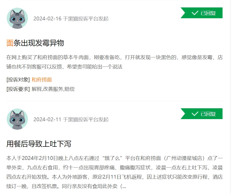 据查,在黑猫投诉上,存在127条和府捞面相关投诉,其中内容大多为“面条发霉”“出现虫子”“盖子黑点”等。
