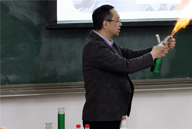 (中氢新能创始人周明强在北大课堂演示可安全点燃氢气的储氢装置 孟涛 摄)