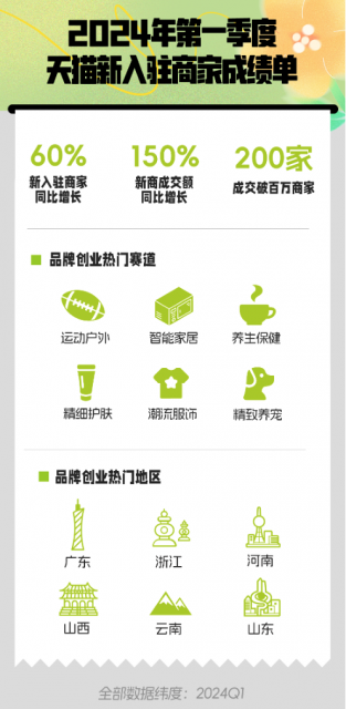 今日,天猫公布2024年第一季开店数据:新入驻商家同比增长60%,全球大牌、新锐品牌加速入驻天猫。其中,运动户外、智能家居、养生保健、精致养宠、潮流服饰、精细护肤等成为今年热门赛道,新商数量同比增长100%。