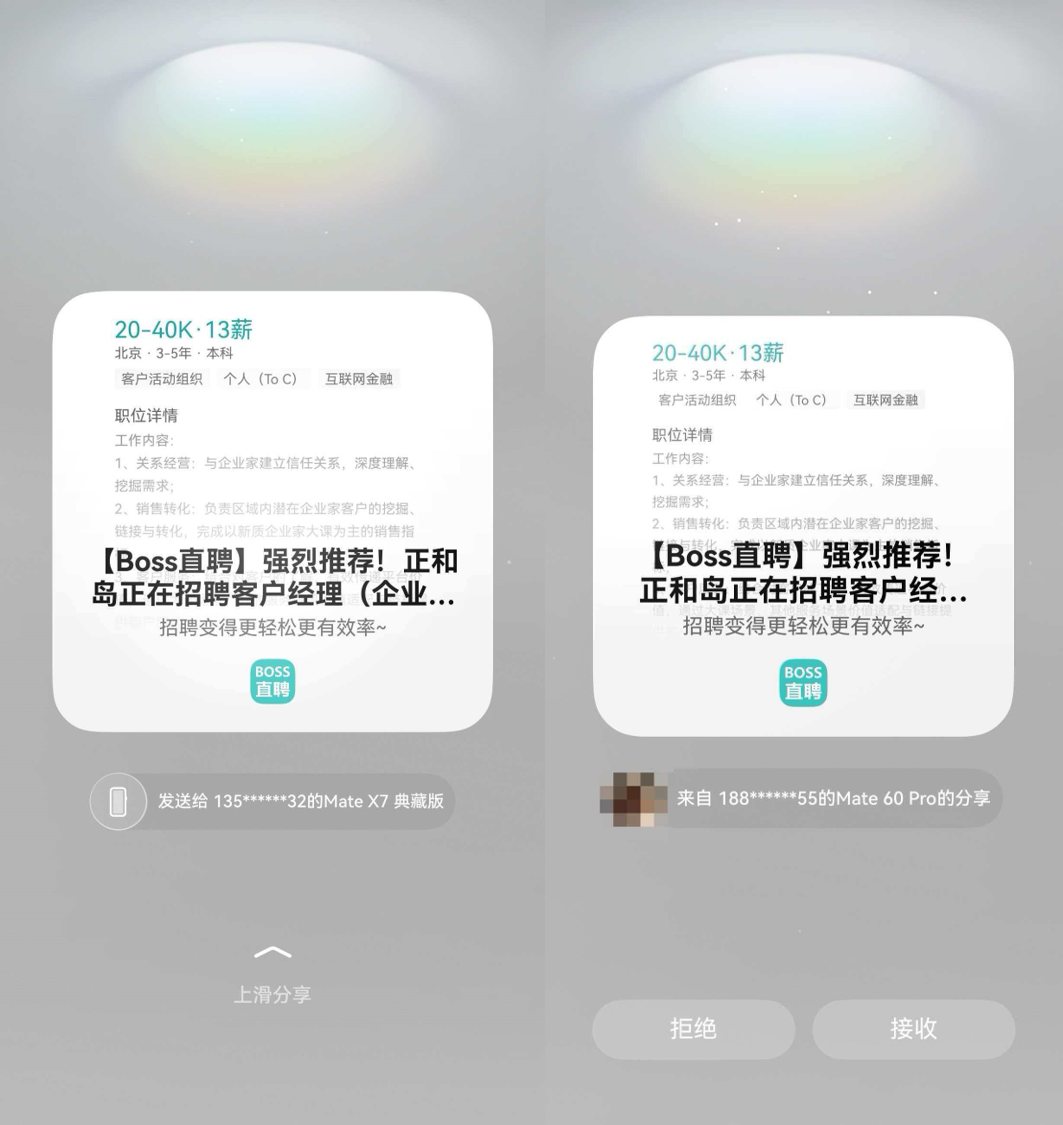 看到好职位想推给朋友?以前要复制链接、切微信、粘贴发送。现在?两台鸿蒙手机轻轻一碰,职位信息直接传过去。或者一抓一放,隔空传送。内推这件事,终于从“麻烦别人”变成了“顺手的事”,像递一张名片那么简单。