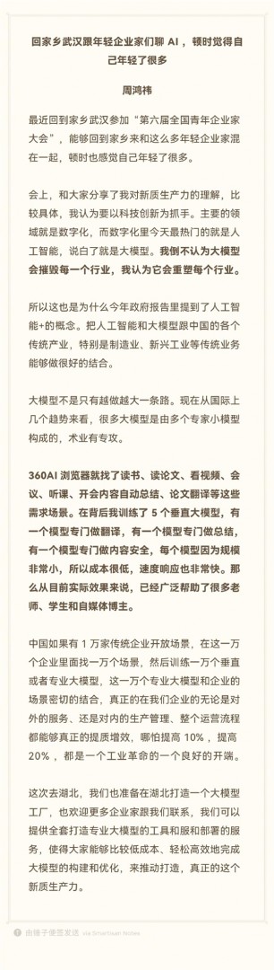 5月20日消息,周鸿祎最近回到家乡武汉,参加“第六届全国青年企业家大会”,分享了自己对AI的思考。