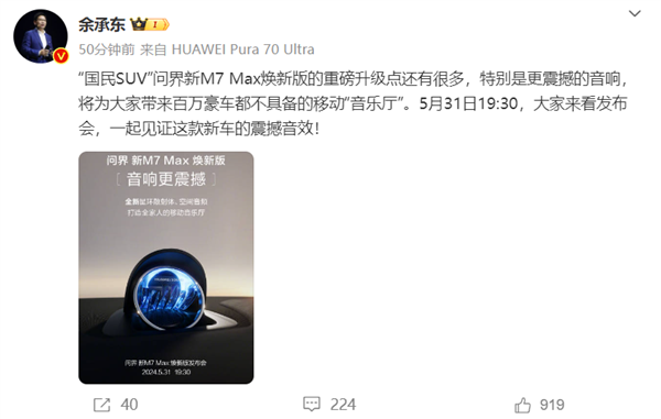 余承东今日发文称,问界新M7 Max焕新版将为大家带来百万豪车都不具备的移动“音乐厅”,车辆音响更震撼。