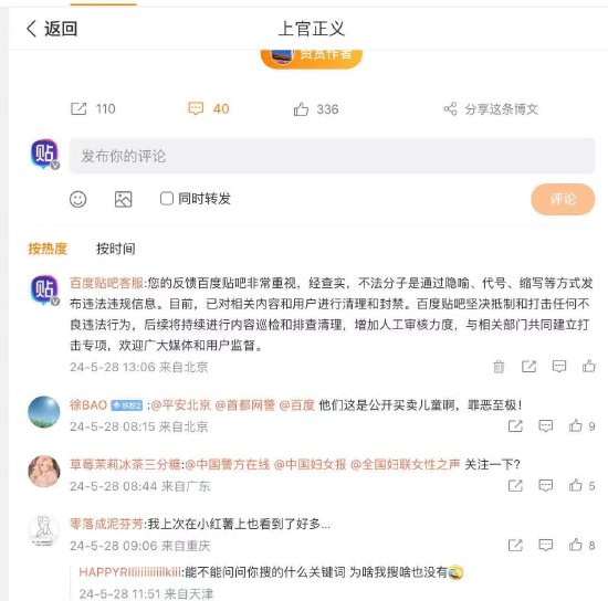 近日,打拐志愿者上官正义曝在百度贴吧里,长期存在公开以送养名义买卖孩子(预定孩子),也有贩卖出生证明中介在此物色客户,为买卖孩子提供洗白身份服务。从其罗列的证据来看,孩子的价格在这里也已公开标售为20万;主要以开设贴吧、评论,通过谐音、字母替代、暗语等话术;也有直接公开发布送养、领养、办理出生证等。上官正义称,曾向百度官方反馈过,但未获得回应。