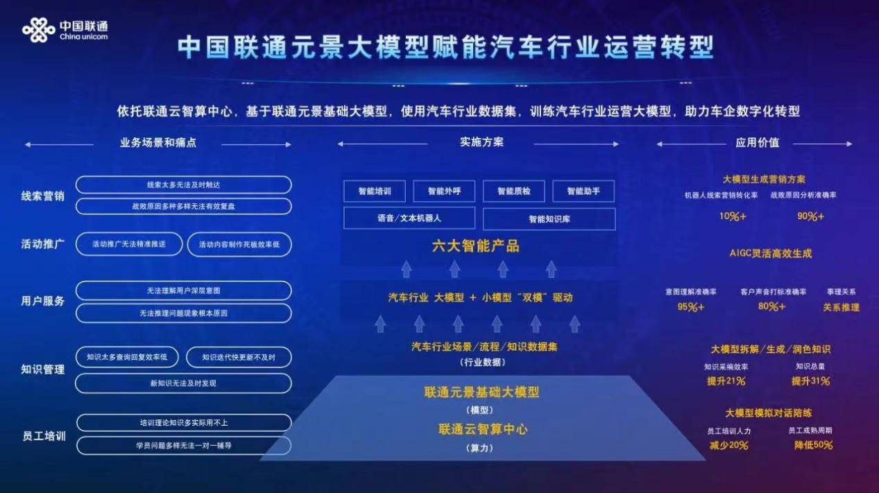 中国联通元景车联网运营大模型是联通智网科技基于多年在汽车行业累积的运营经验,结合联通云智算中心的强大计算能力,以联通元景基础大模型为根基精心训练而成的行业专属大模型。