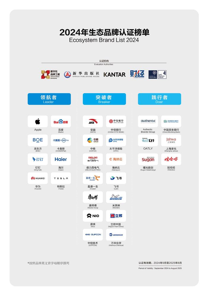 本届“生态品牌认证”由新华社品牌工作办公室、新华出版社、凯度集团、《财经》杂志和牛津大学赛德商学院联合评选,采取“品牌申报+认证方遴选”相结合的新方法确定上榜品牌,除了分析申请认证品牌及其同业品牌外,还遴选“凯度BrandZ全球最具价值品牌数据库”中符合要求、表现突出的品牌数据和案例。