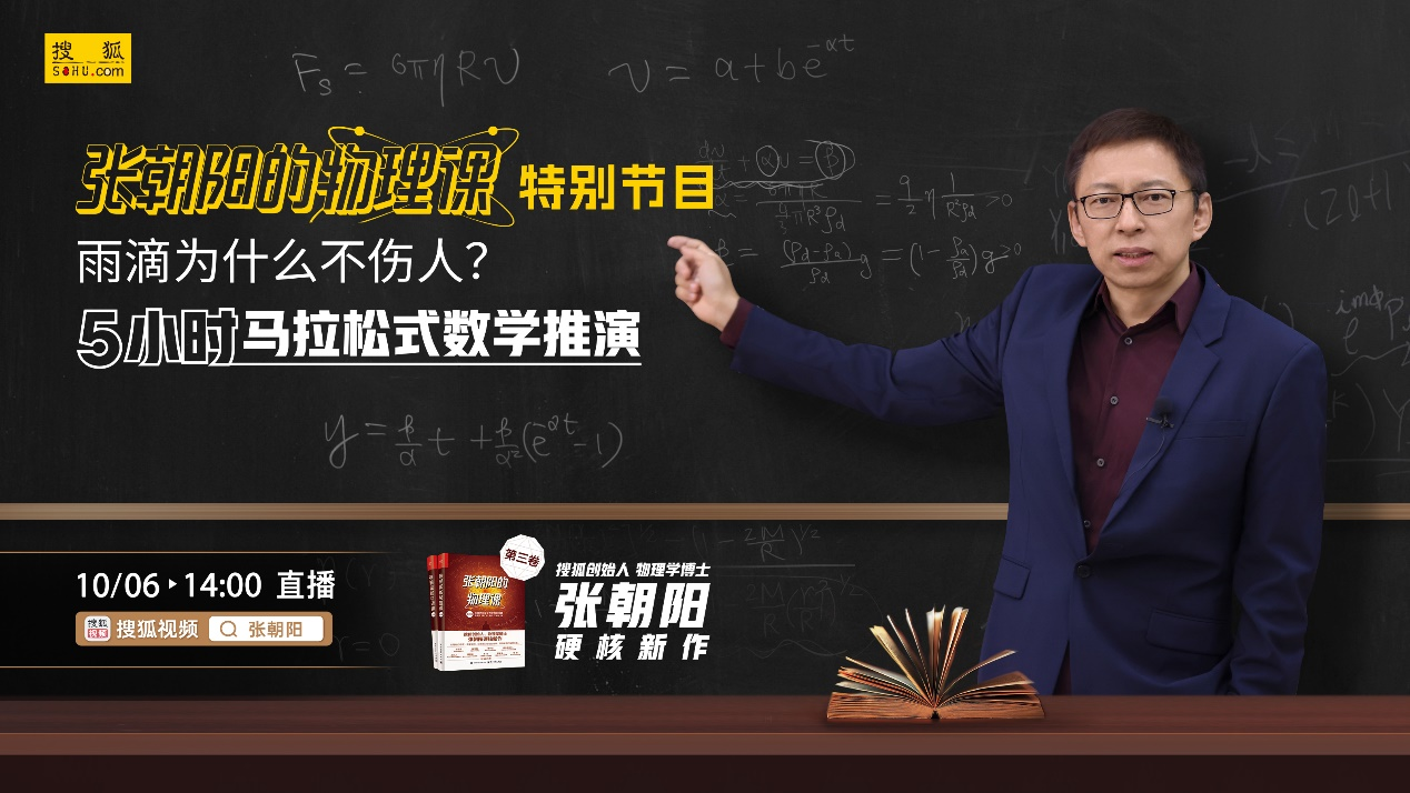 10月6日14:00,《张朝阳的物理课》将开启国庆特别节目,搜狐创始人、董事局主席兼首席执行官、物理学博士张朝阳将围绕“雨滴为什么不伤人?”主题,5小时不间断开展马拉松式的数学推演,为假期带来一场别开生面的“数学盛典”。届时,在搜狐视频APP搜索“张朝阳”账号即可观看直播。