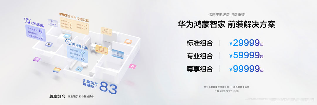 华为鸿蒙智家前装解决方案专为毛坯房、旧房重装需求人群订制,29999元起的标准组合,基于星闪TM蓝牙多合一连接,满足灯光氛围便捷开关、智能窗帘控制、空调智能温控、居家安防等智能基础控制需求;59999元起的专业组合在此基础上针对无感灯光控制、影音娱乐再升级,显著提升氛围体验;99999元起的尊享组合则为用户提供主动健康空气、空间主题、家庭影院等更为丰富的智能家居解决方案,智慧生活一步到位。
