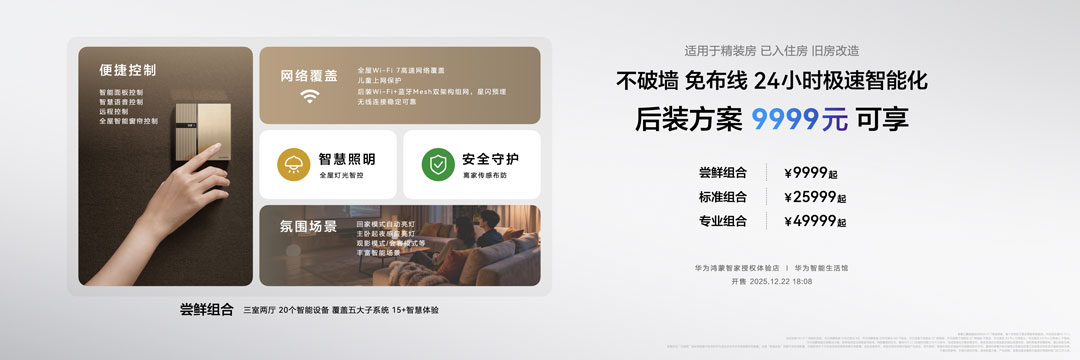 华为鸿蒙智家后装解决方案可满足精装房及已入住房、旧房改造需求群体,套餐主打“不破墙、免布线”,最快“24小时极速焕新”。尝鲜组合低至9999元,包含照明、遮阳、网络、冷暖新风、安防五大子系统,配备新款华为鸿蒙智家 智能主机EZ 星闪版。25999元起的标准组合则加入了更贴心的安防能力和针对儿童睡眠的AI辅助康养传感器;49999元起的专业组合在提供更多氛围光场景体验的同时,设备覆盖量也更多,进一步提升居住舒适度。
