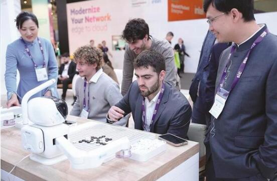 图为观众在中国移动MWC24展台与机器人交互