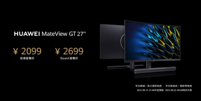 华为MateView GT 27英寸Sound版售价2099元,华为MateView GT 27英寸标准版售价2699元,两款产品将于9月13日21:08开始预约,9月25日0点正式开售。华为商城、京东、天猫、苏宁易购等授权电商平台和线下门店将同步进行预约和售卖。对于追求影音娱乐效果的朋友,这款27英寸的显示器不容错过。