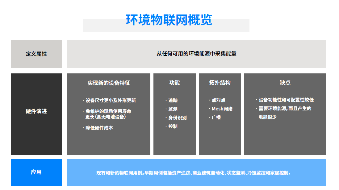 图1:环境物联网的定义属性、物联网硬件发展和应用(来源:ABI Research)