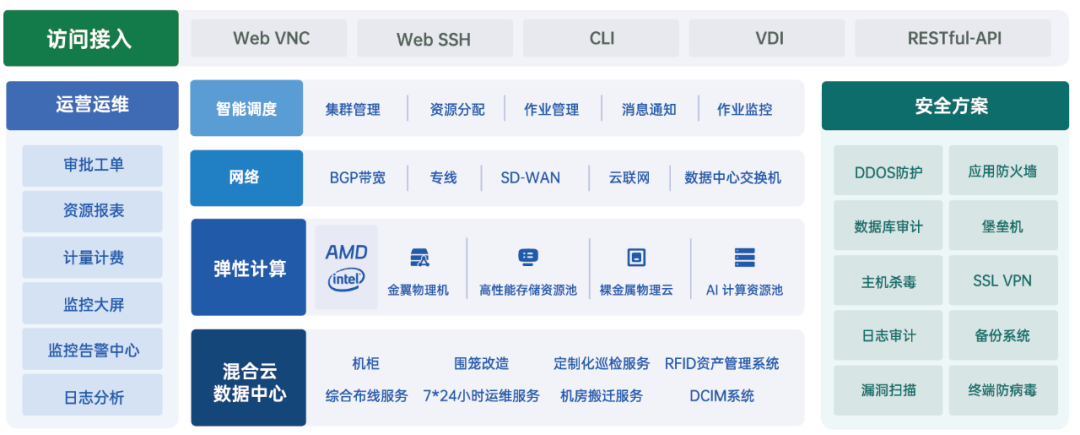 提供包括弹性算力资源池、托管机柜、网络、专线在内的整套云计算解决方案,同时具备7x24h专属运维和快速响应的服务能力,确保客户的业务系统稳定运行。