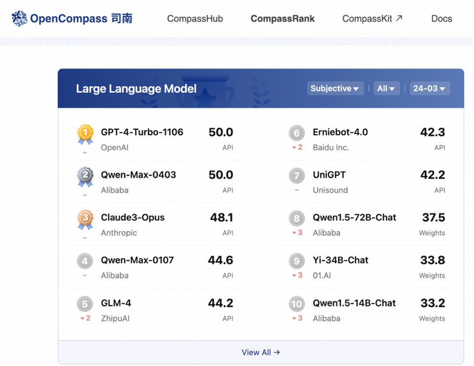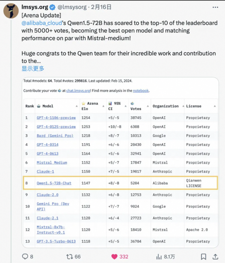 通义72B、110B开源模型都曾登顶OpenLLMLeaderboard榜首。在开放研究机构LMSYSOrg推出的基准测试平台ChatbotArena上,通义72B模型多次进入“盲测”结果全球Top10,创造了国产大模型的先例。