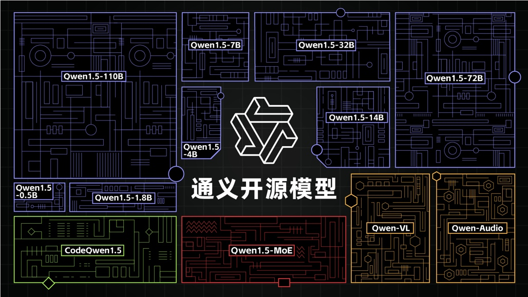 为顺应不同场景用户需求,通义推出参数规模横跨5亿到1100亿的八款大语言模型,小尺寸模型如0.5B、1.8B、4B、7B、14B,可便捷地在手机、PC等端侧设备部署;大尺寸模型如72B、110B能支持企业级和科研级的应用;中等尺寸如32B试图在性能、效率和内存占用之间找到最具性价比的平衡点。此外,通义还开源了视觉理解模型Qwen-VL、音频理解模型Qwen-Audio、代码模型CodeQwen1.5-7B、混合专家模型Qwen1.5-MoE。