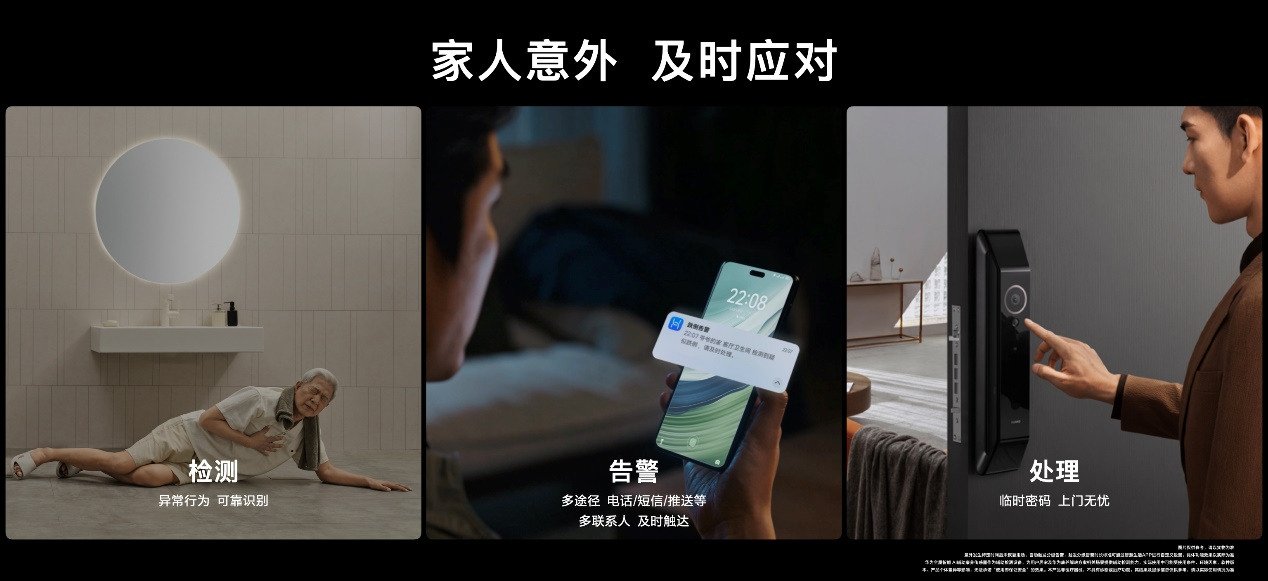 当意外发生后,AI康养解决方案会启动智能分级告警,重要事件将进行重要告警,以拨打电话、发送短信、智慧生活APP提示等多种方式和渠道通知紧急联系人;普通事件则通过智慧生活APP等方式通知到紧急联系人。华为还将开通微信服务号通知功能,丰富与拓展通知形式,让用户拥有更多选择。