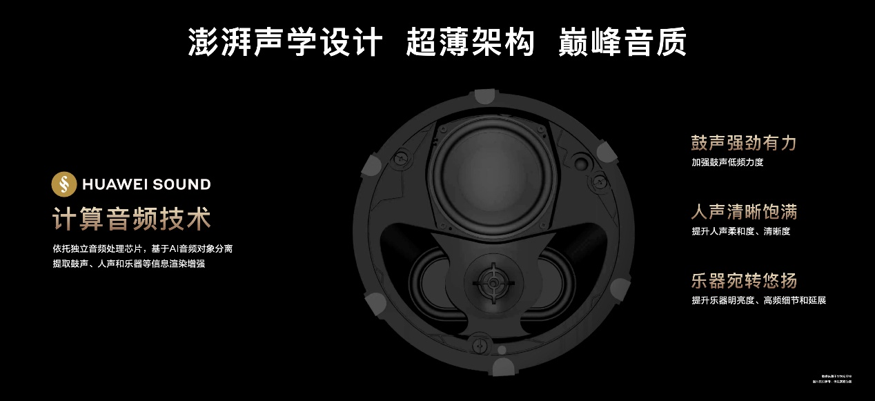 全新发布的华为全屋智能超薄吸顶音箱,采用澎湃声学设计,让音质再次飞跃。8cm的超薄架构,较此前的吸顶音箱减少了近一半的厚度,纤薄的体积,能满足大部分户型吊装场景的安装。同时,华为全屋智能超薄吸顶音箱依托独立的专业音频处理芯片,搭载HUAWEI SOUND计算音频技术,可基于AI音频对象分离,提取人声、鼓声和乐器等对象信息进行渲染增强。通过加强鼓声低频力度,让鼓声强劲有力;提升人声柔和度、清晰度,使人声清晰饱满;提升乐器明亮度、高频细节和延展,令乐器宛转悠扬。