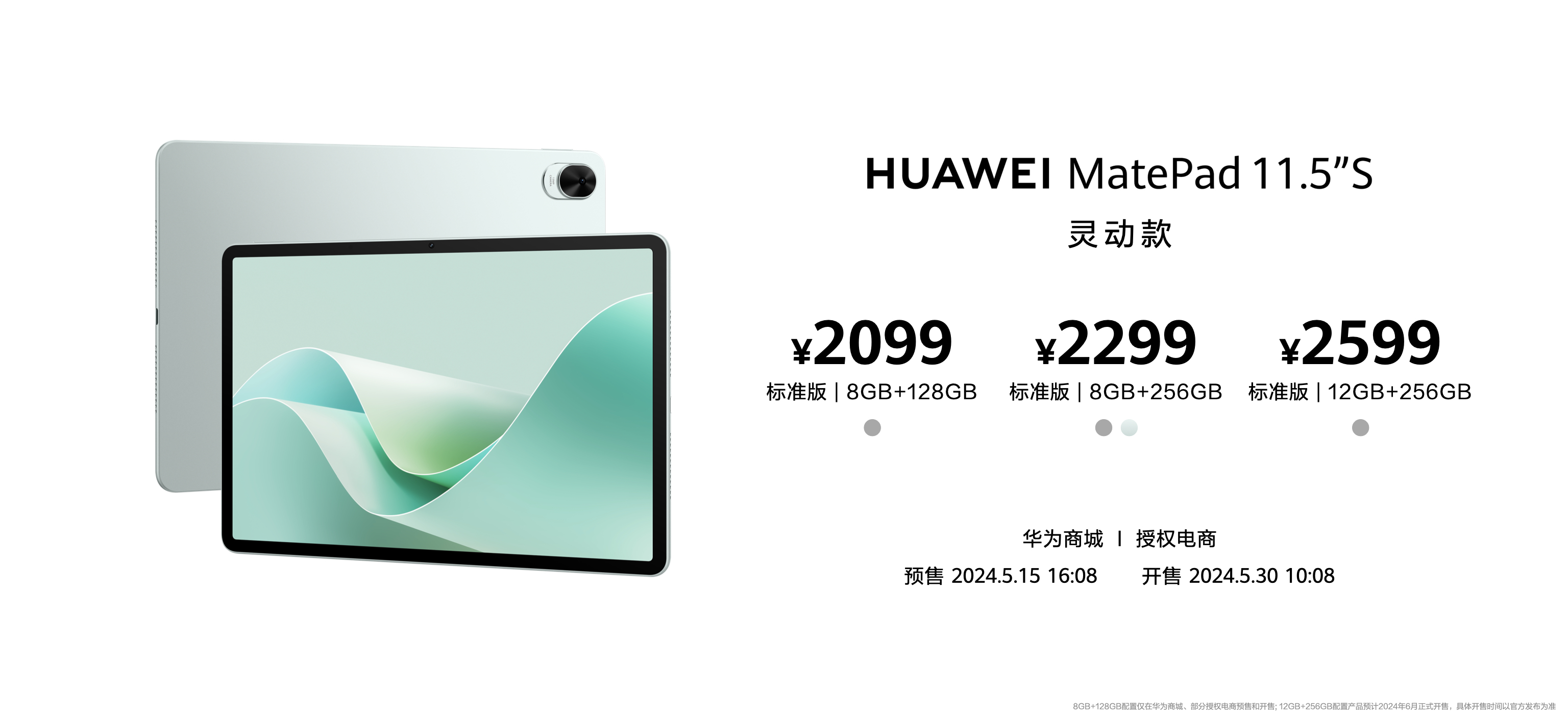 华为MatePad 11.5"S售价2599元起,将于5月15日开启预售,5月30日全渠道正式开售;华为MatePad 11.5"S 灵动款售价2099起,将于5月15日开启预售,5月30日华为商城及授权电商平台正式开售,欢迎前往选购。