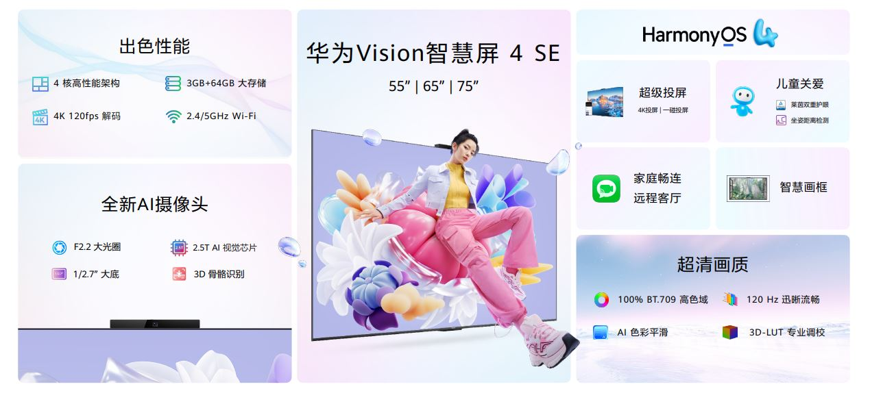 华为 Vision智慧屏 4 SE新品搭载全新升级4K超级投屏功能,通过“超清、超快、超稳、超流畅”的优势,为追求物超所值、有强投屏需求人群提供出色投屏体验。相较于上一代,华为Vision智慧屏 4 SE在搭载鸿蒙操作系统的基础上,从性能、音画上全新升级,新一代高清AI摄像头、鸿鹄画质、4K超高清全面屏等丰富配置,让智慧体验再越级,为用户带来更为多元的新潮体验。