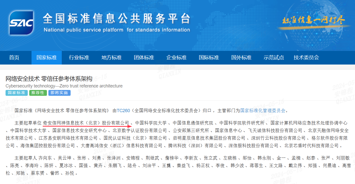 《网络安全技术 零信任参考体系架构》的制定历经四年,由奇安信集团董事长齐向东担任项目负责人。在全国网络安全标准化技术委员会的管理指导下,奇安信联合零信任领域国内一流的产学研用机构,在给出零信任基本概念、零信任参考体系架构等内容上开展了大量研究工作,并最终推动标准顺利发布。