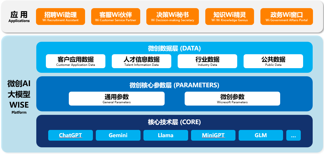 发布会上微创软件同时发布了基于AI大模型WISE平台架构开发的5款企业级AI应用产品,包括决策Wi助手、政务Wi窗口、知识Wi精灵、招聘Wi助理,以及客服Wi伙伴。该应用通过WISE平台的AI学习大模型和大数据训练,为企业客户提供了数据分析、商业决策、政务服务、企业智库、人才招聘上全新AI级的解决方案。