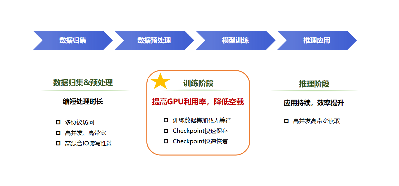 ● 模型训练:需高效加载数据至GPU进行计算,对存储性能有严格要求(高IOPS、高带宽、低延迟),以确保训练过程的流畅与高效。