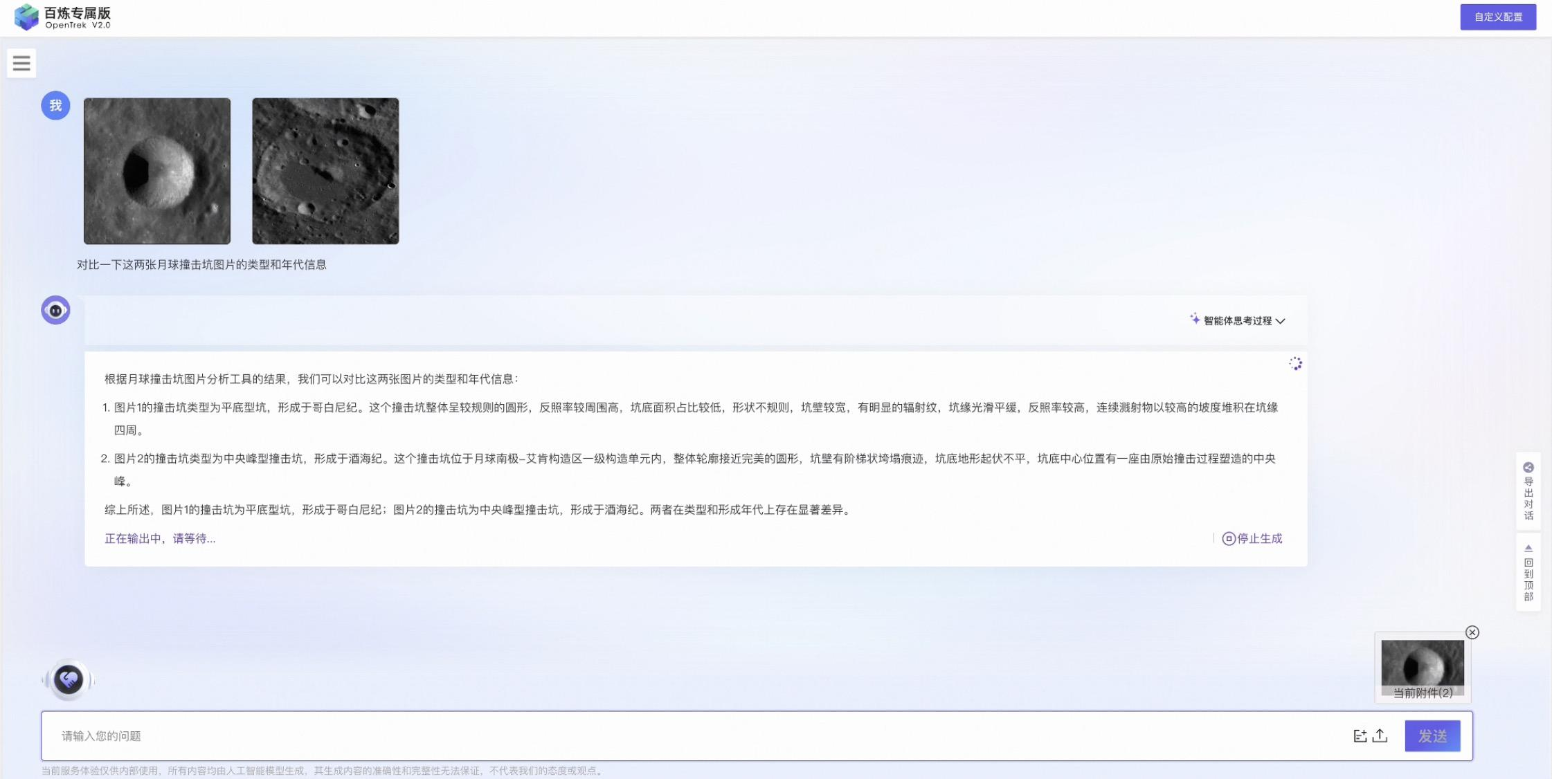 月球专业大模型的应用极大提高科研效率。科研工作者只需输入月球撞击坑图像和相关问题,月球专业大模型即可调用通义视觉、多模态模型,从17种多模态数据中(包括光谱、高程、重力等数据)判定该图像对应的模态类型;通过检索知识库、调用通义语言模型,月球专业大模型可回答该撞击坑的形态、大小、年代等相关问题,并给出推理过程。