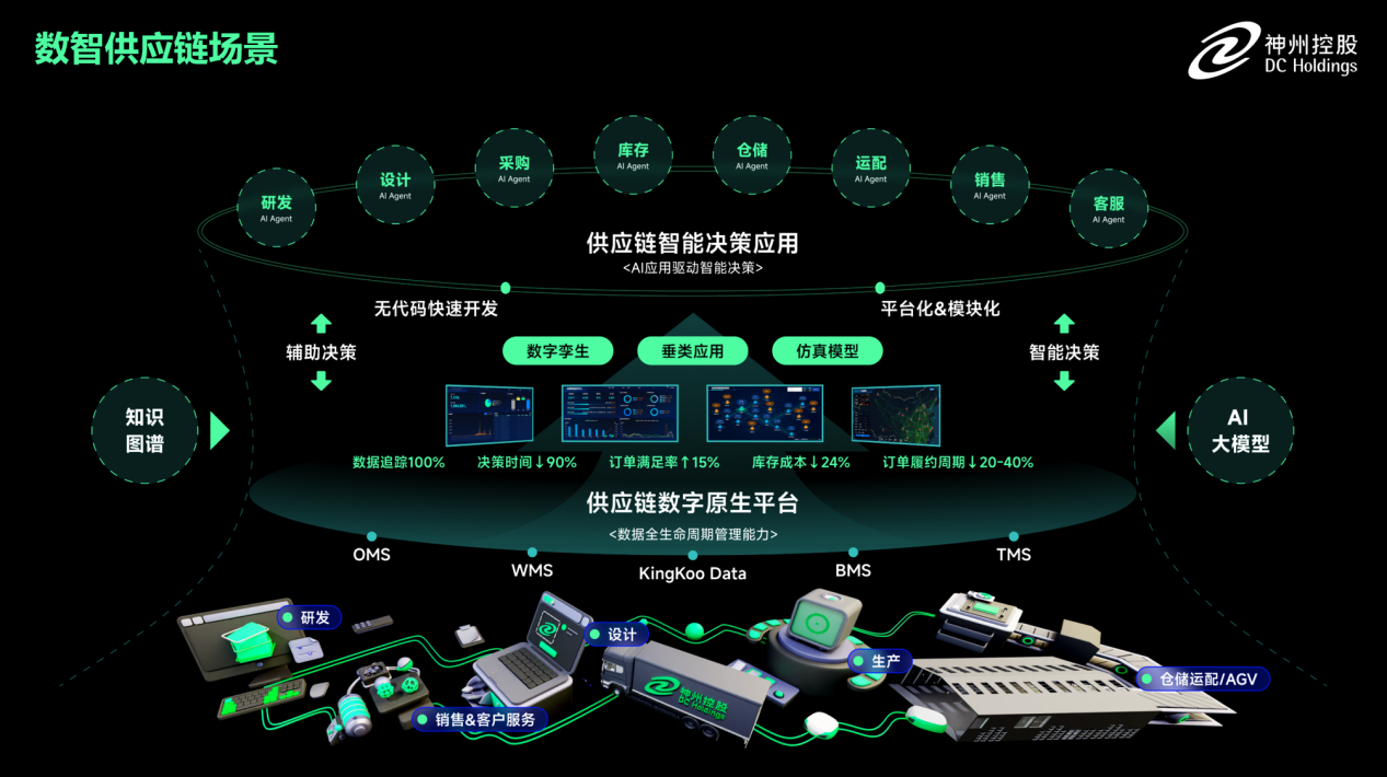 其次,在推进数据智能场景化应用方面,神州控股瞄准企业供应链数据智能应用场景,结合自身在供应链领域二十余年的运营经验,为企业打造以数据+AI为核心的供应链控制塔解决方案。该方案提供从设计、研发、订单、生产、仓储、运输到销售及客户服务的端到端供应链全链条数据资产管理能力,并能够以可视化界面的形式提供数据洞察、分析及智能决策。在实际应用中,帮助客户取得了业务数字平台化100%,数据可追踪性100%,决策时间下降90%,订单满足率提升15%,库存成本降低24%,订单履约周期下降20-40%的卓越成效。