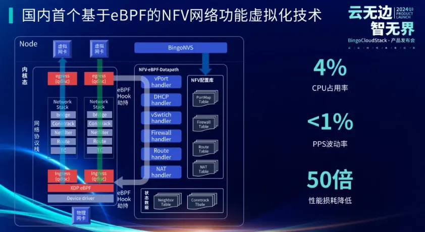 l 首创基于eBPF的可编程NFV(网络虚拟化)技术。实现了转发面和控制面的分离,网络服务挂了虚拟机还能正常运行。主要的网元都已经实现了虚拟化,且是分布式的。功能丰富、扩展容易、性能强悍、资源占用低能充分适应并满足边缘环境下的资源占用需求。