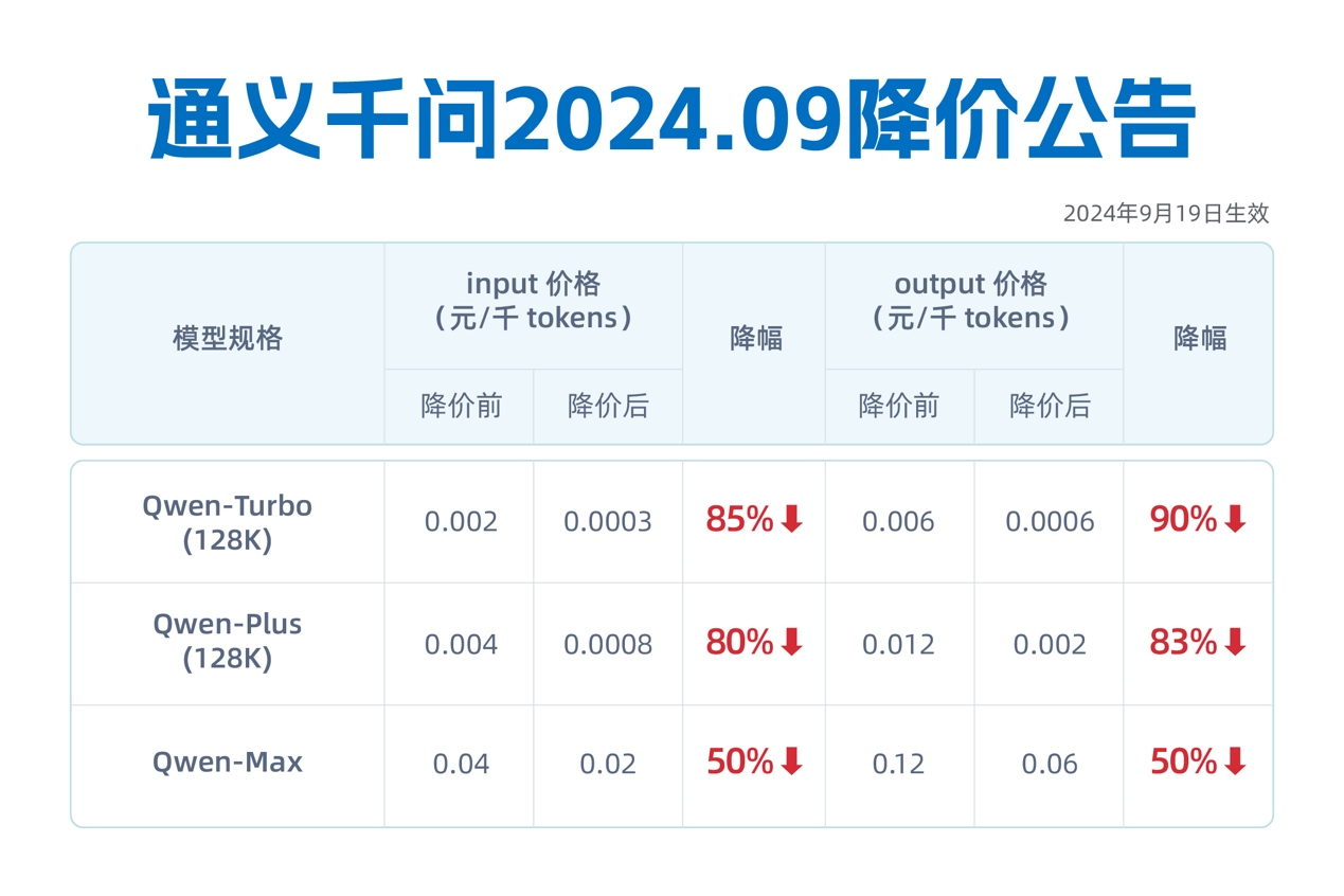 9月19日,继5月首次大幅降价后,阿里云百炼平台上的三款通义千问主力模型再次降价。Qwen-Turbo价格直降85%,低至百万tokens 0.3元,Qwen-Plus和Qwen-Max分别再降价80%和50%。其中,Qwen-Plus推理能力追平GPT4,可应用于复杂任务,是效果、速度及成本均衡的最优选择,降价后,Qwen-Plus性价比达到业界最高,同等规模较行业价格低84%。同时,阿里云百炼平台还为所有新用户免费赠送超5000万tokens及4500张图片生成额度。