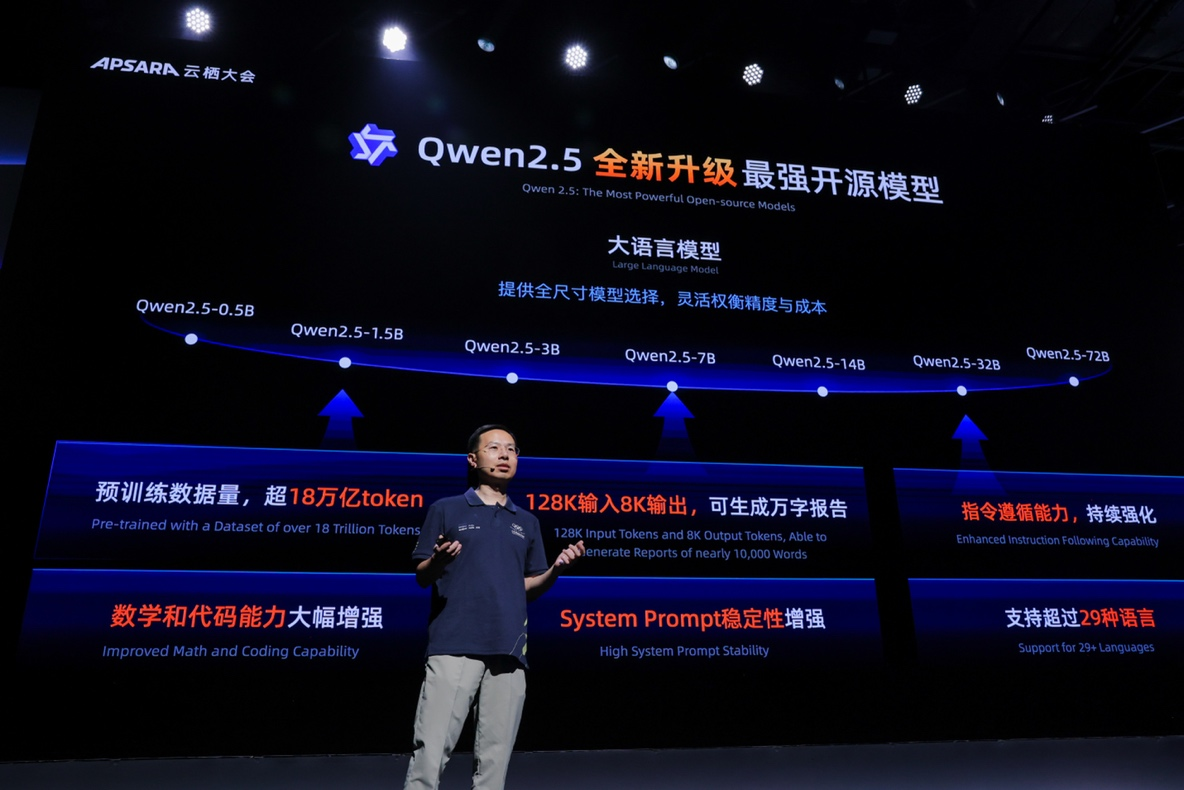 9月19日云栖大会,阿里云CTO周靖人发布通义千问新一代开源模型Qwen2.5,旗舰模型Qwen2.5-72B性能超越Llama 405B,再登全球开源大模型王座。Qwen2.5全系列涵盖多个尺寸的大语言模型、多模态模型、数学模型和代码模型,每个尺寸都有基础版本、指令跟随版本、量化版本,总计上架100多个模型,刷新业界纪录。