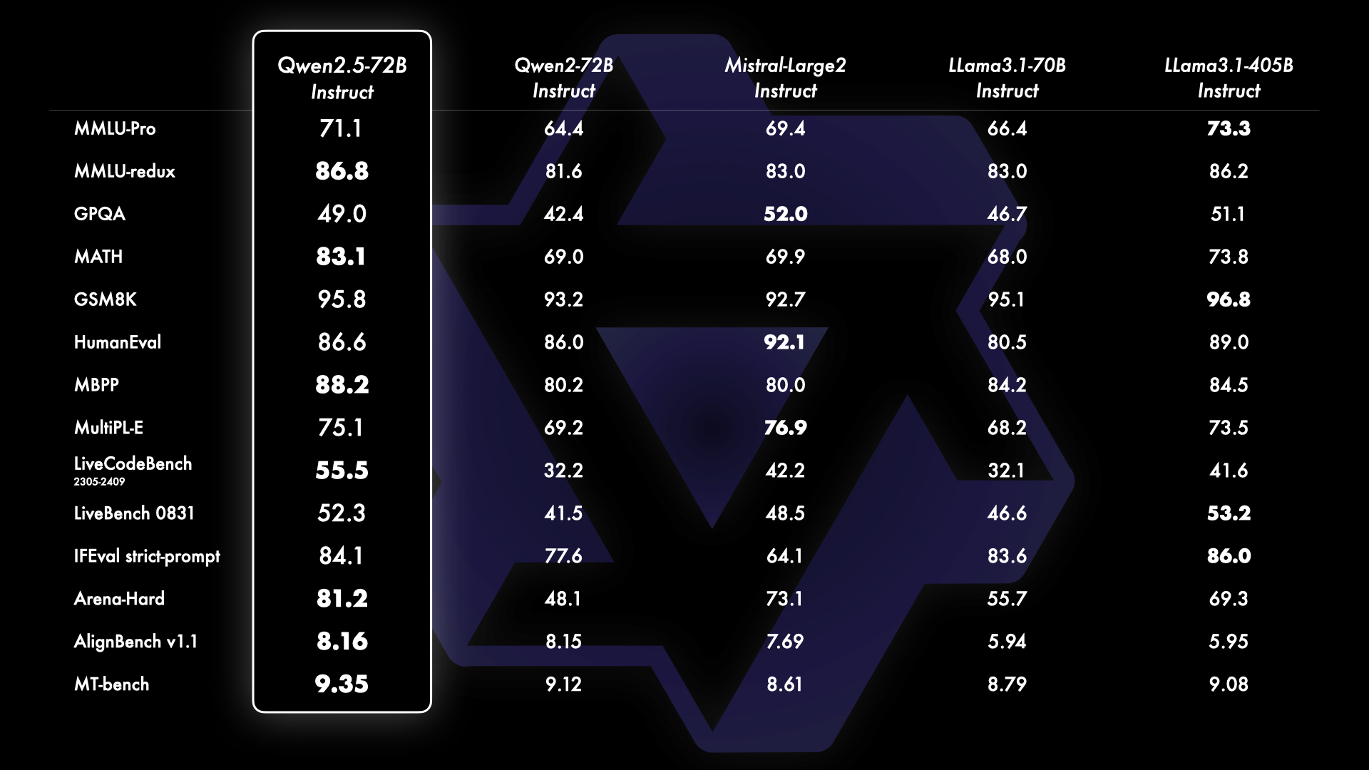 72B是Qwen2.5系列的旗舰模型,其指令跟随版本Qwen2.5-72B-Instruct在MMLU-redux、MATH、MBPP、LiveCodeBench、Arena-Hard、AlignBench、MT-Bench、MultiPL-E等权威测评中表现出色,在多个核心任务上,以不到1/5的参数超越了拥有4050亿巨量参数的Llama3.1-405B,继续稳居“全球最强开源大模型”的位置。