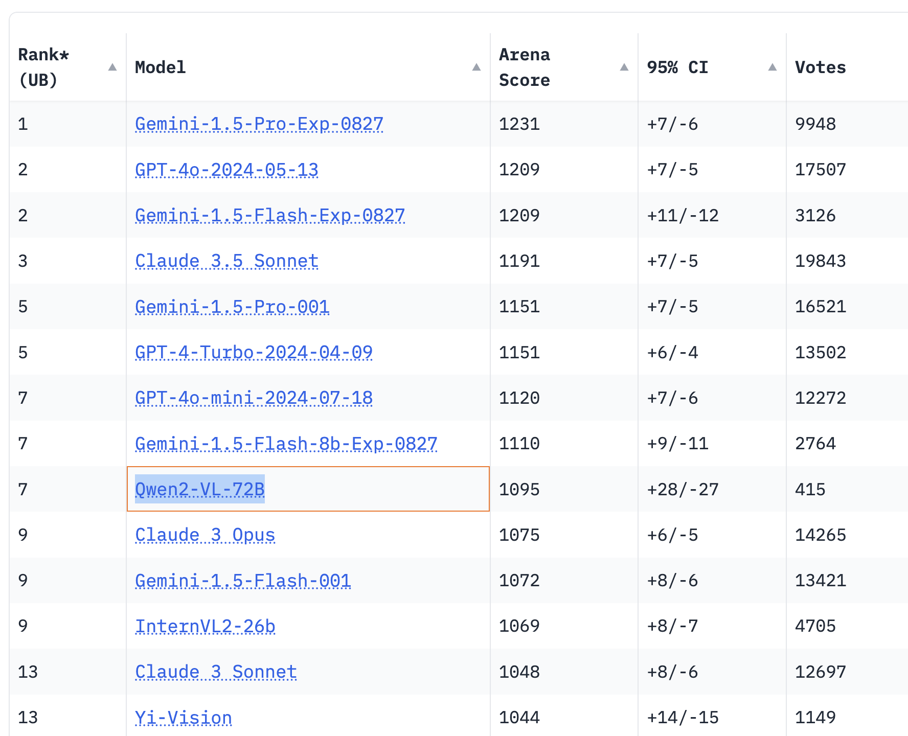 Qwen2-VL-72B在权威测评LMSYS Chatbot Arena Leaderboard成为成为全球得分最高的开源视觉理解模型