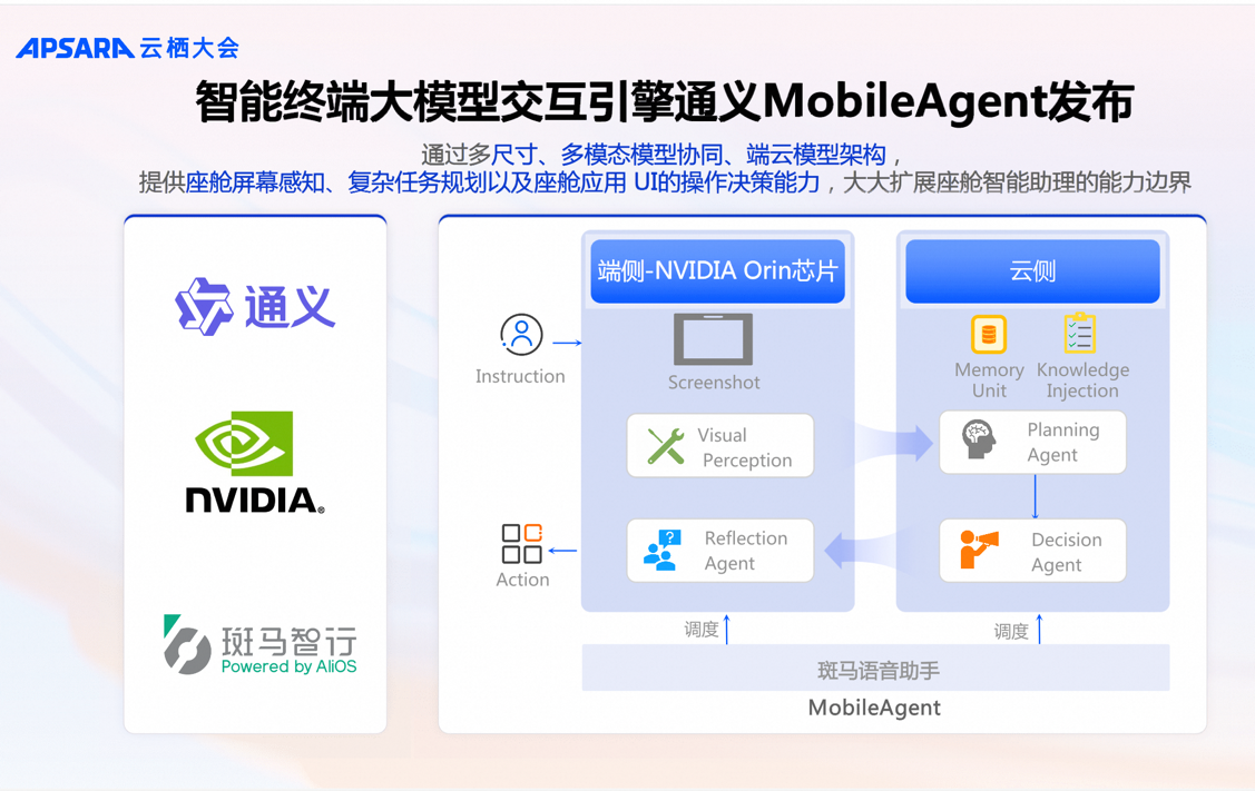 这个解决方案以通义大模型为“大脑”,集成了通义大语言模型Qwen2-7B和通义多模态模型Qwen2-VL。Qwen2-VL是阿里通义实验室研发的新一代视觉语言模型,具备业界最强的图片识别能力和视觉智能体能力,在多个国际权威测评中创下同等尺寸最优成绩。Qwen2-VL的2B和7B参数模型因其性能和尺寸的“极致性价比”,尤其适合汽车等端侧场景。同时,通义实验室最新发布的 Mobile Agent V3 首次落地汽车座舱场景,提供座舱屏幕感知、复杂任务规划以及座舱应用 UI的操作决策能力,大大扩展座舱智能助理的能力边界。