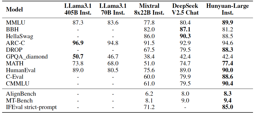 腾讯混元Large 在各类测试集上得分领先现有主流开源模型