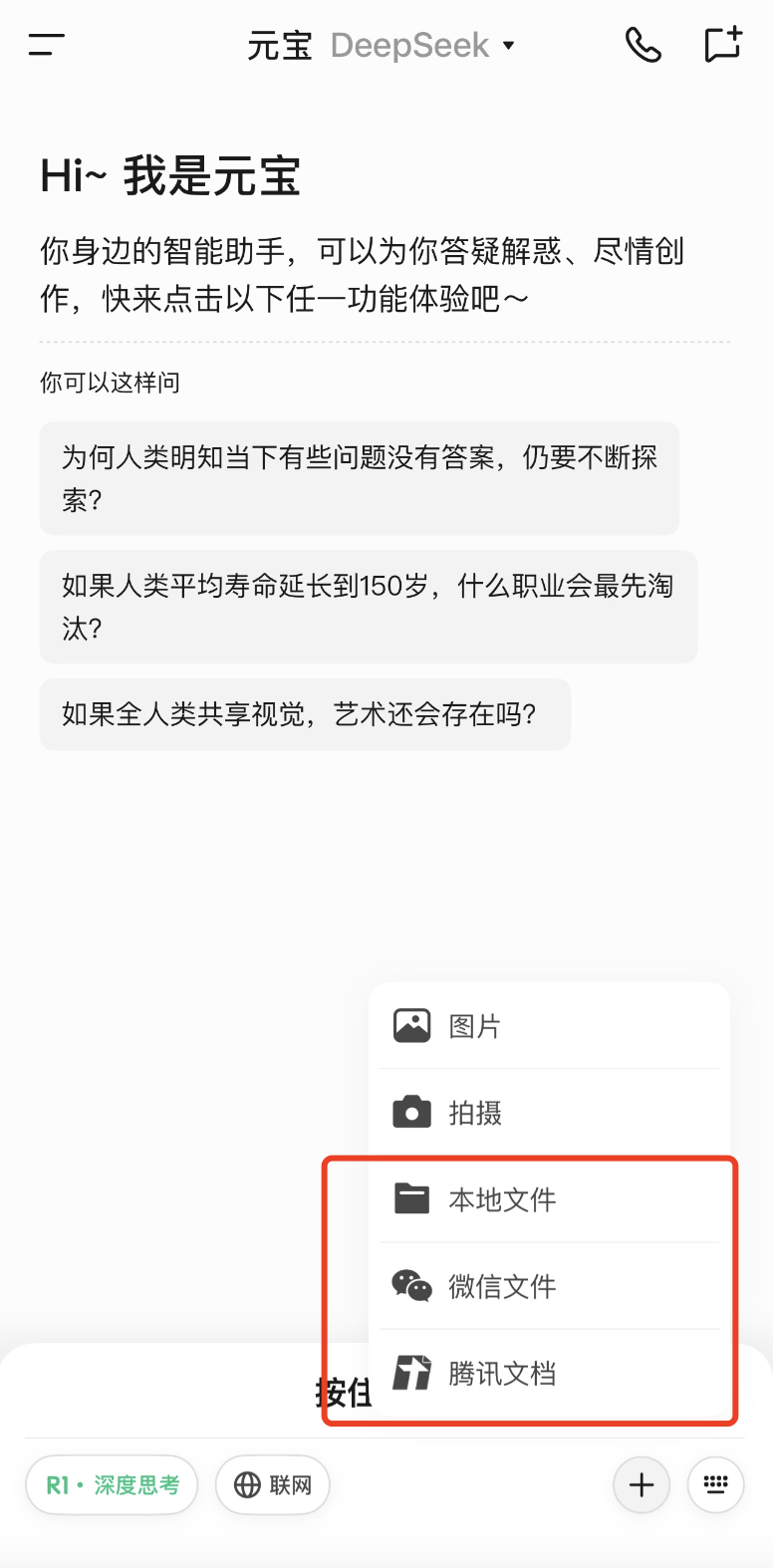 打开腾讯元宝,点击上传文件,并选择“上传腾讯文档”,通过跳转登陆,即可勾选腾讯文档中的文件进行上传,目前支持的文档格式包括文档、表格、PPT、PDF、思维导图、智能文档和收集表。