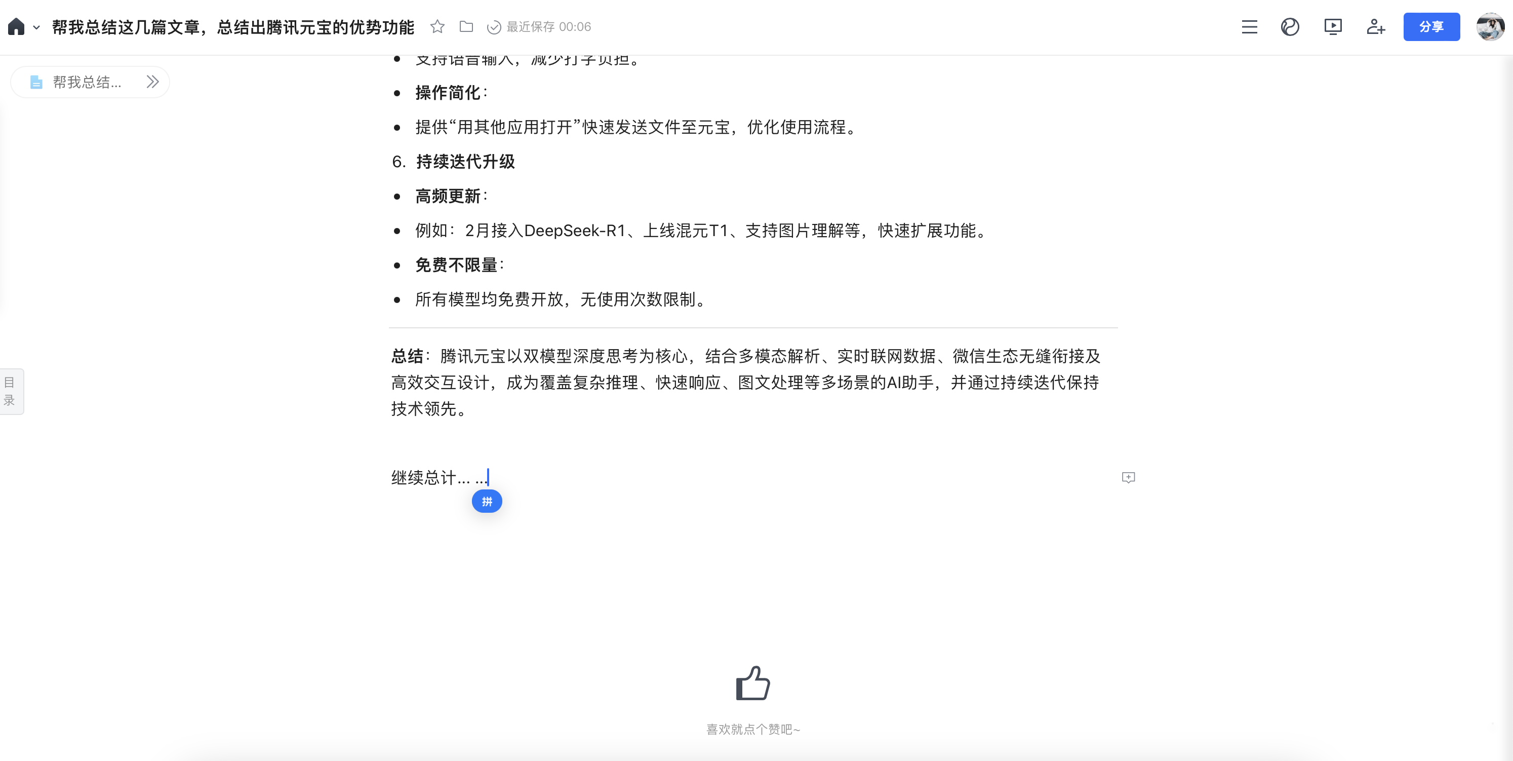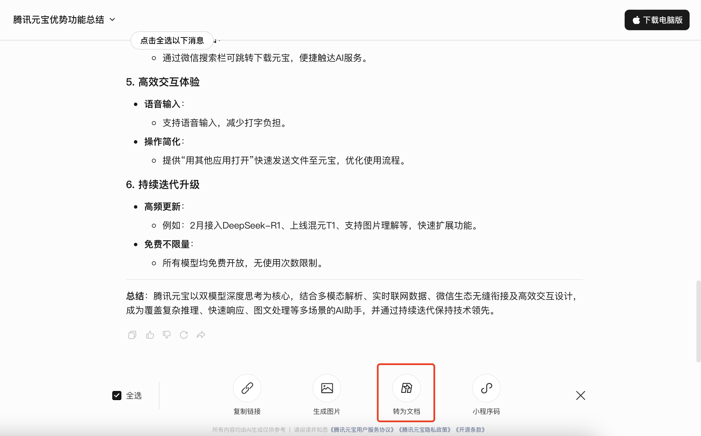 此外,用户也可以把在腾讯元宝中生成的内容,选择“分享”,并一键保存为腾讯文档,导出后的文档也可以直接进行查看、编辑、二次创作和分享。