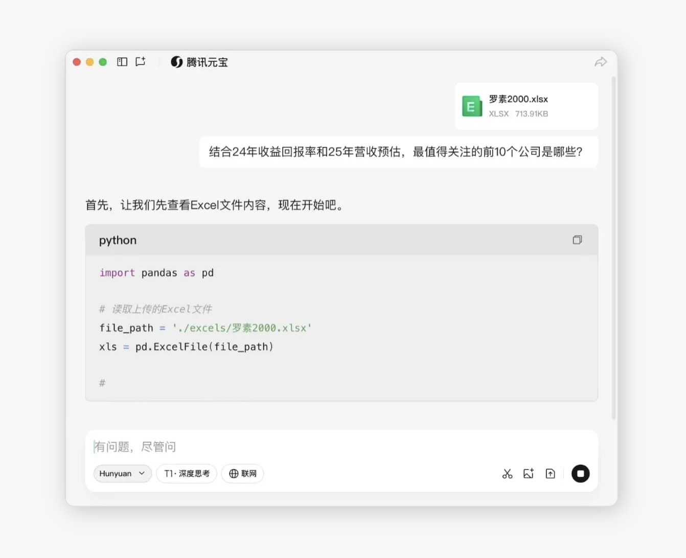 值得注意的是,面对数据量较大的表格,用户可以选择切换至混元、并关闭深度思考。这样,快思考模型混元 Turbo S即可自动生成代码,帮助用户高效处理和分析复杂表格。